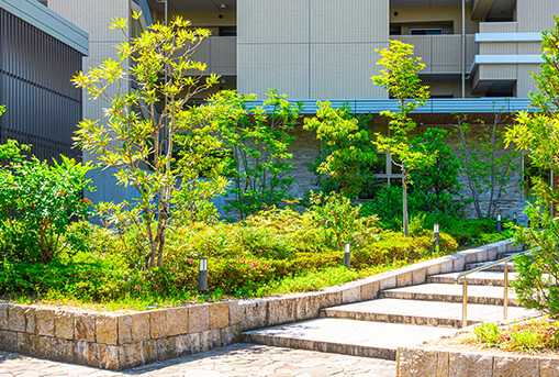 建物の庭に樹木を設置したり、植木の一新を行い、建物の印象を一新させます。資産価値の向上に樹木を活用し、イメージアップを図ります。